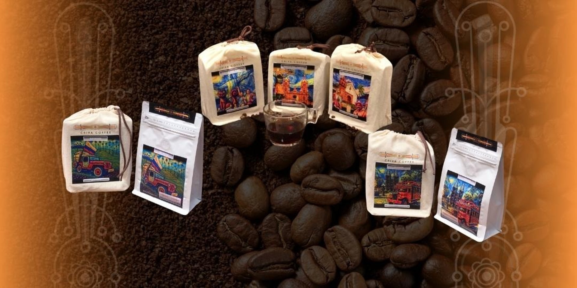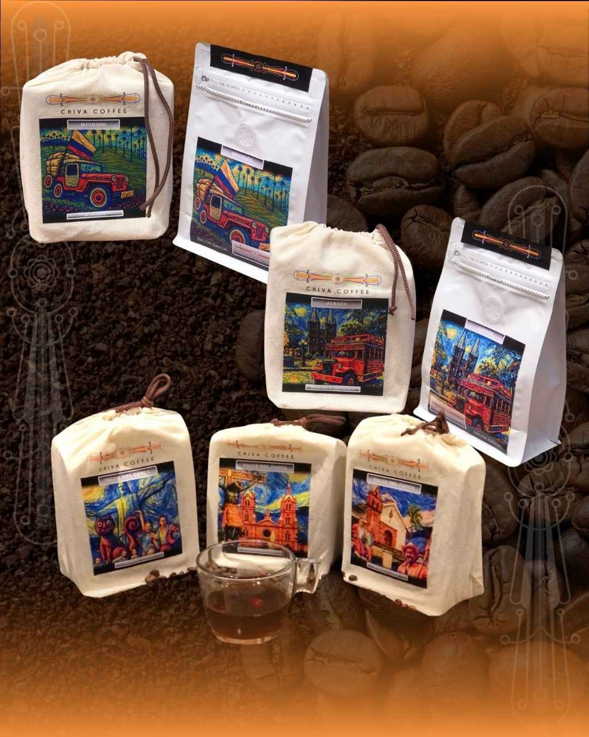 Cada empaque es único, inspirado en la naturaleza, la cultura y los colores de la Chiva. Descubre la experiencia completa de cada café y llévate a casa una pieza de arte y tradición.